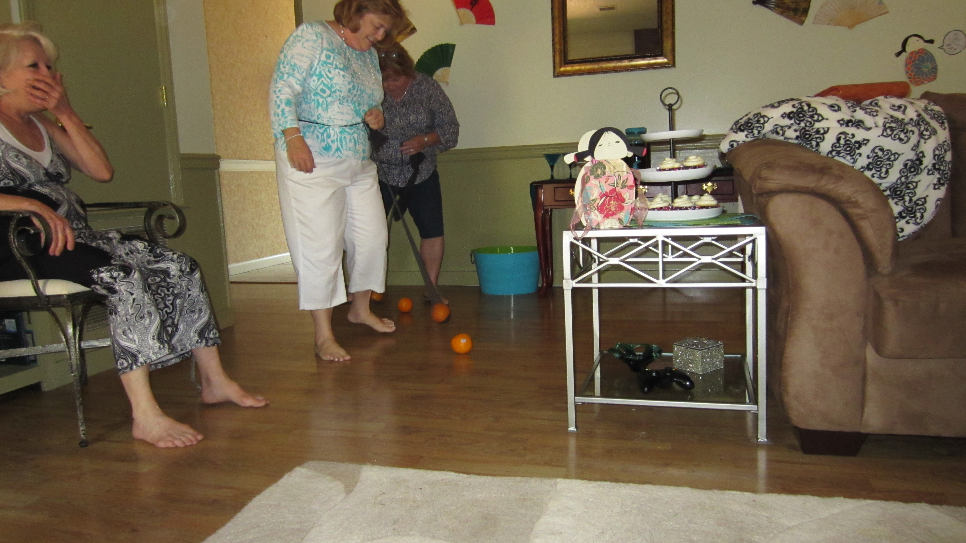 The last one was absolutely my favorite. So basically what you do is put an orange in the foot of a pair of stockings. You tie the other foot around your waist so that the orange is dangling in a totally inappropriate, weird way close to the floor. You have to use your hips to swing (think pelvic thrust) your little orange sack into another orange on the floor– trying to get it across a finish line before the other person you’re racing. Here is some photo evidence to better explain: