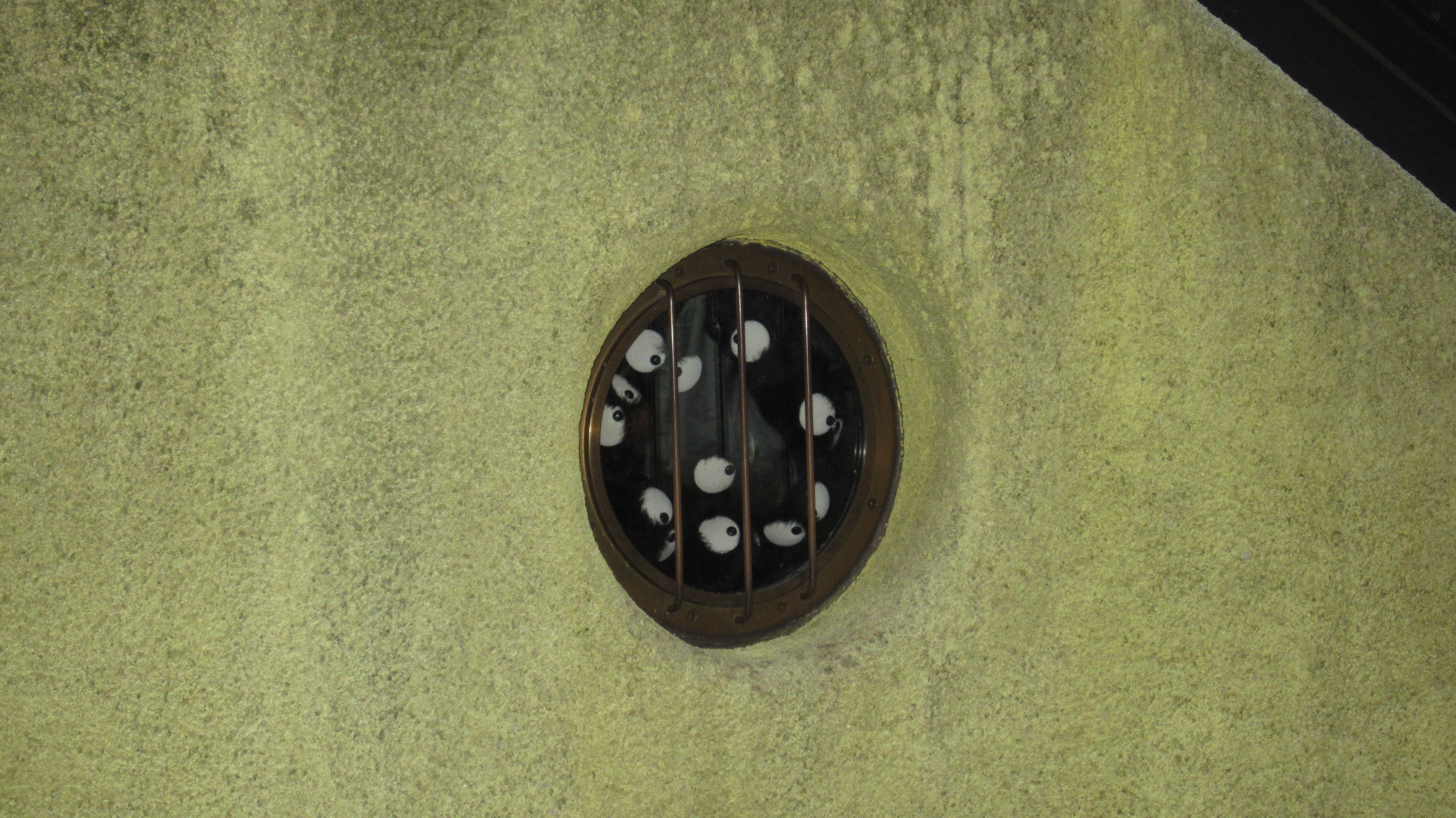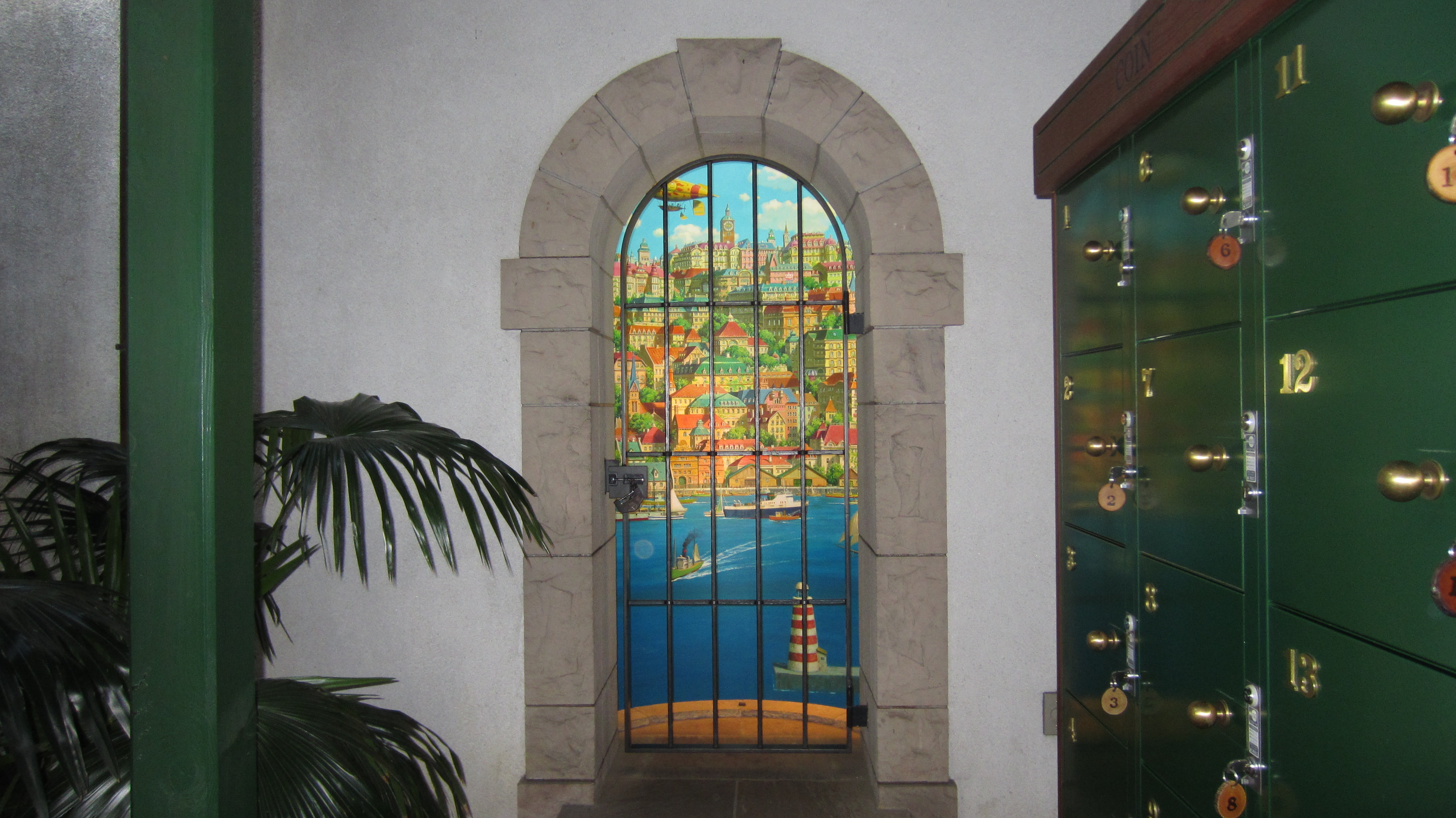A scene from a window near the locker boxes (where people were parking their strollers, extra belongings– that kind of thing.) Maybe the city by the sea where Kiki lives?