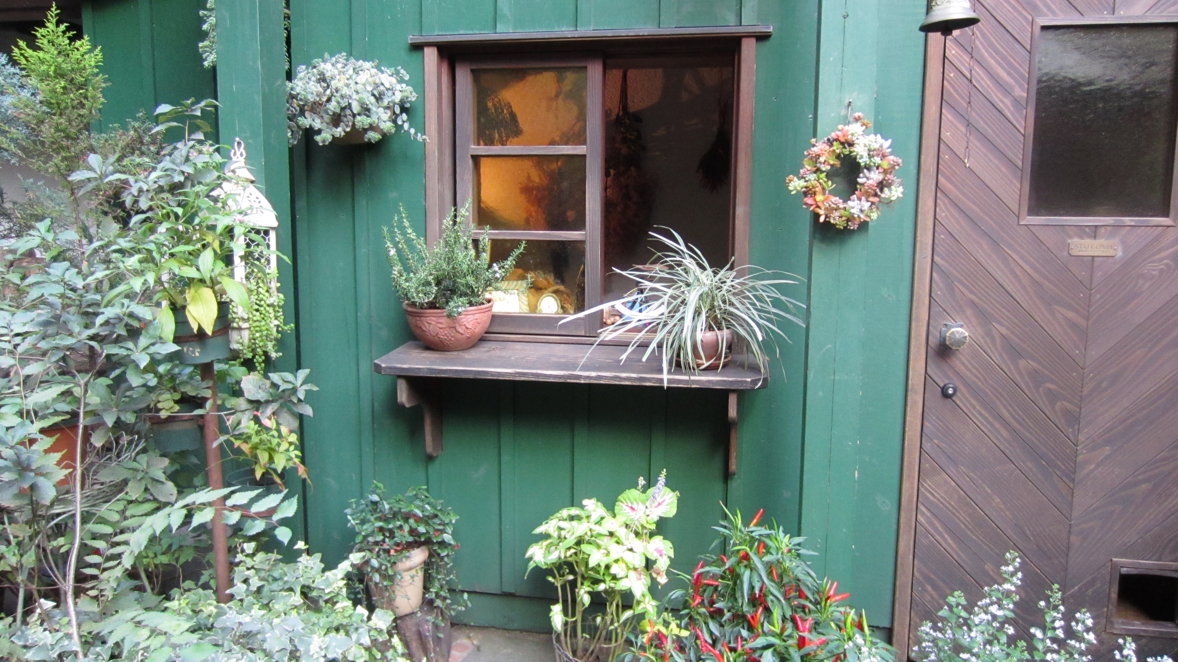 Downstairs and outside. Next to a working, old-fashioned water pump: