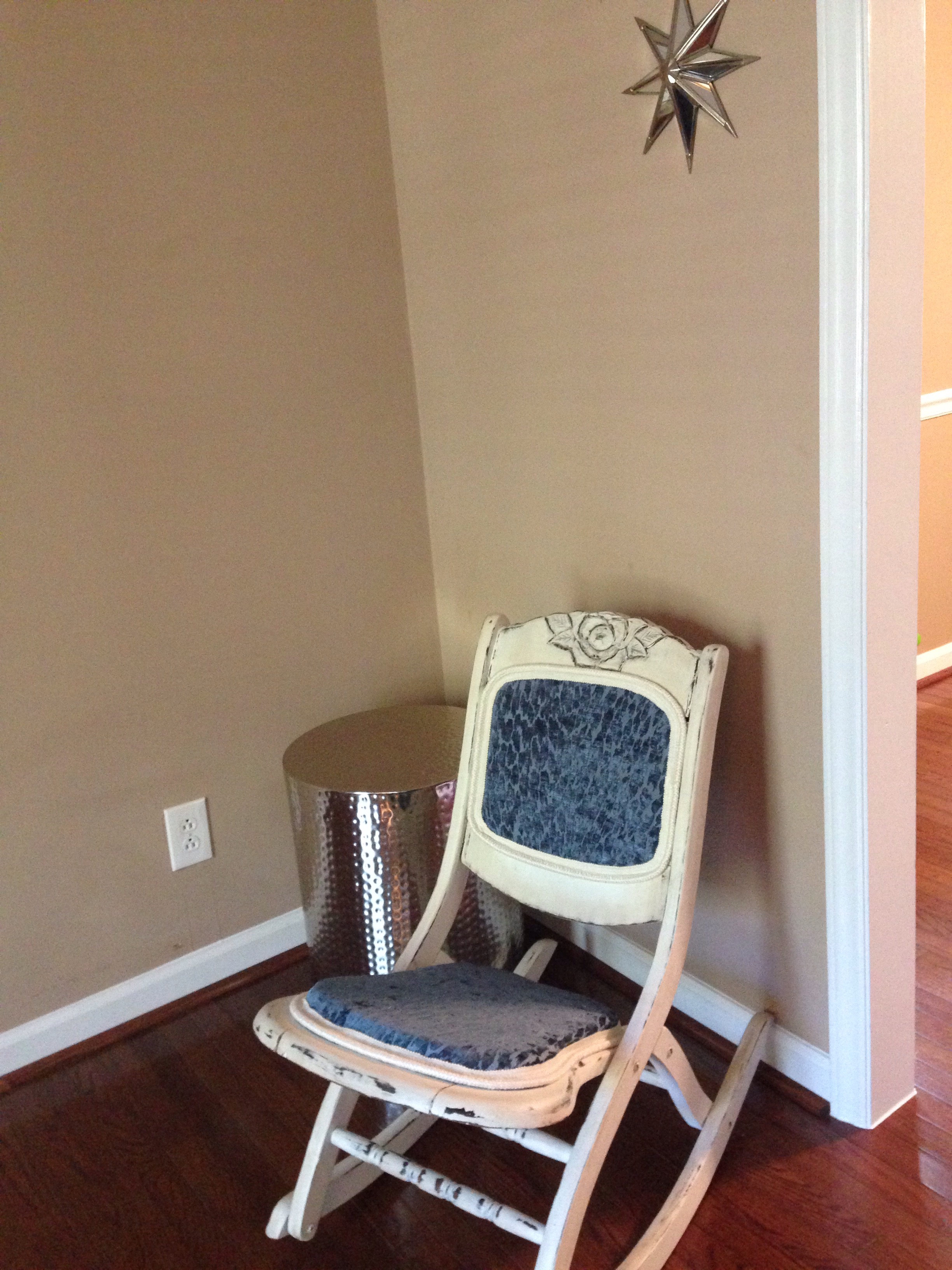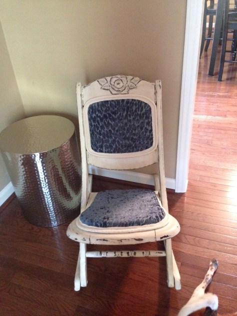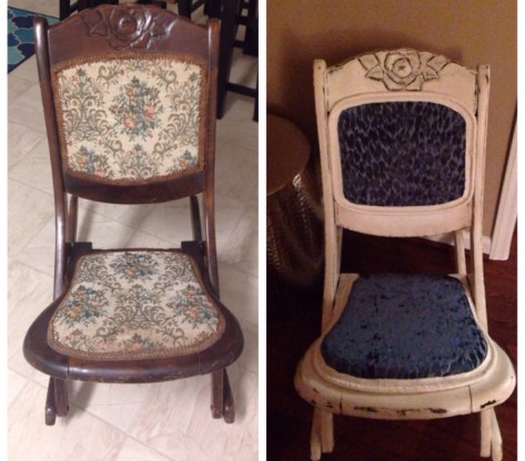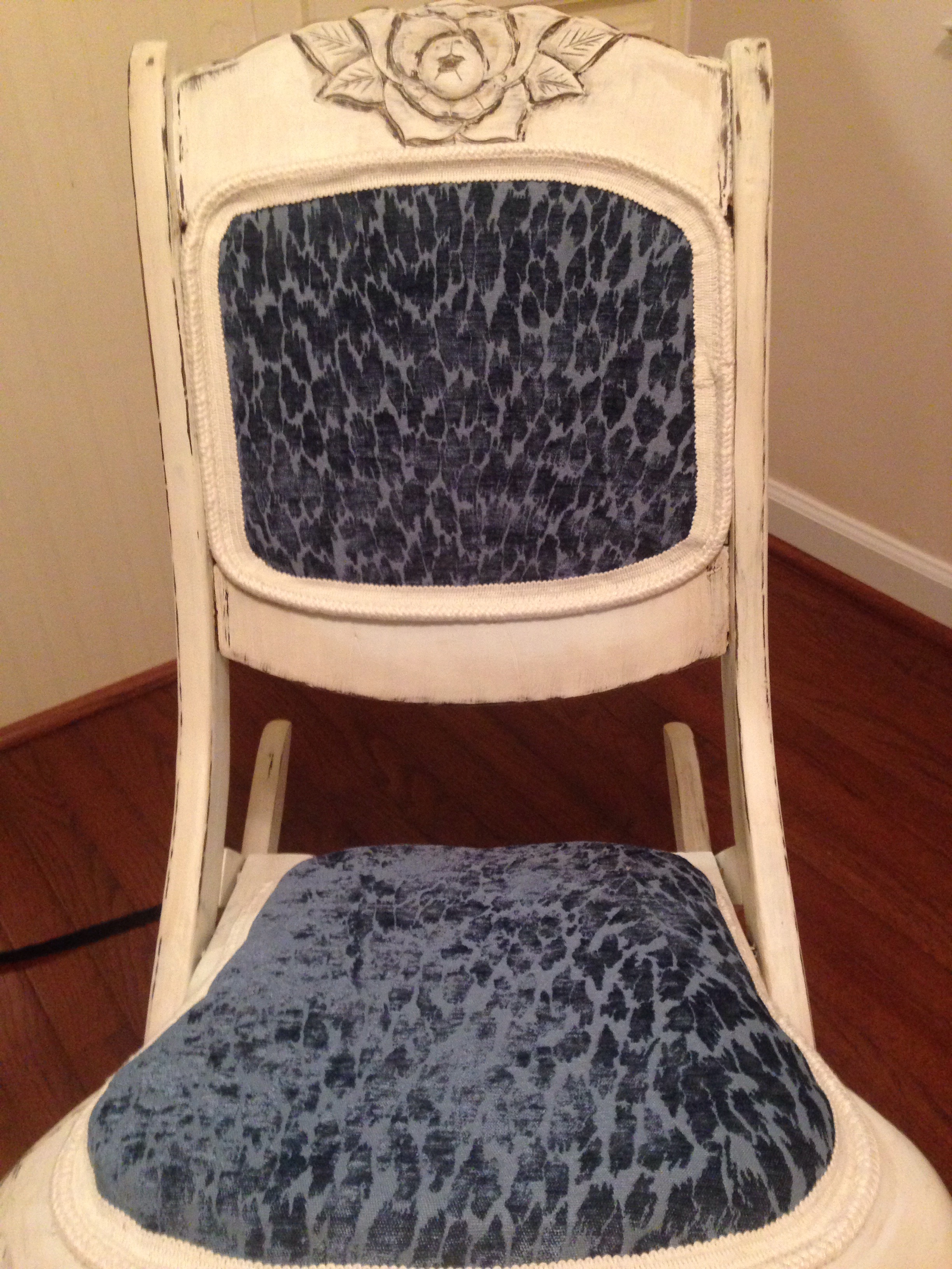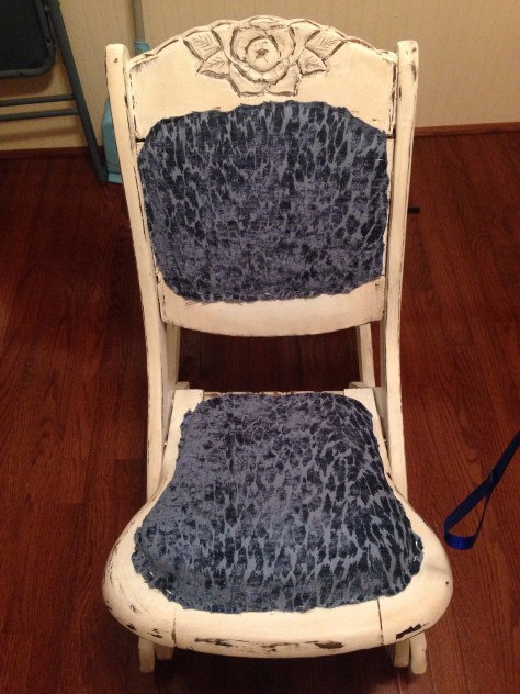 I fell in love with this blue velvet burnout fabric a few months ago while searching for something to cover the heirloom chair I mentioned in the previous post. I bought two yards of it, not knowing what I would end up using it for. It looks beautiful on this little rocker, right?